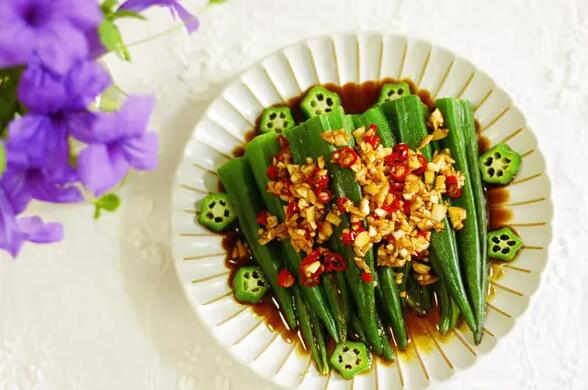 1.將秋葵洗凈放開水中焯水2分鐘左右(開水中放1勺鹽、1勺油,這樣秋葵顏色會更鮮亮);撈出瀝干,切掉秋葵蒂;