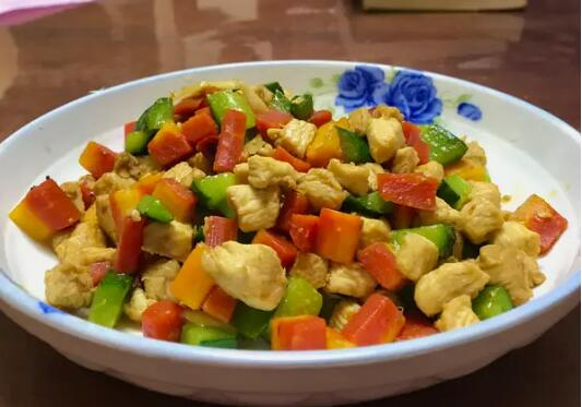 2.小鍋中加水燒開,將胡蘿卜丁放入開水中,加入少許鹽和食用油,煮3分鐘后撈起瀝干;起鍋燒油,放入適量生抽,待油燒至七分熱時倒入雞丁,翻炒至七分熟,加入小蔥、姜絲,再加入黃瓜丁和胡蘿卜丁,繼續(xù)大火快炒;
